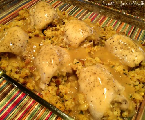Stuffed Chicken with Gravy 6 boneless, skinless chicken thighs* 1 6-ounce box chicken stuffing mix (such as Stove Top) 2 12-ounce jar chicken gravy Salt, pepper and granulated garlic to taste Click here for directions
